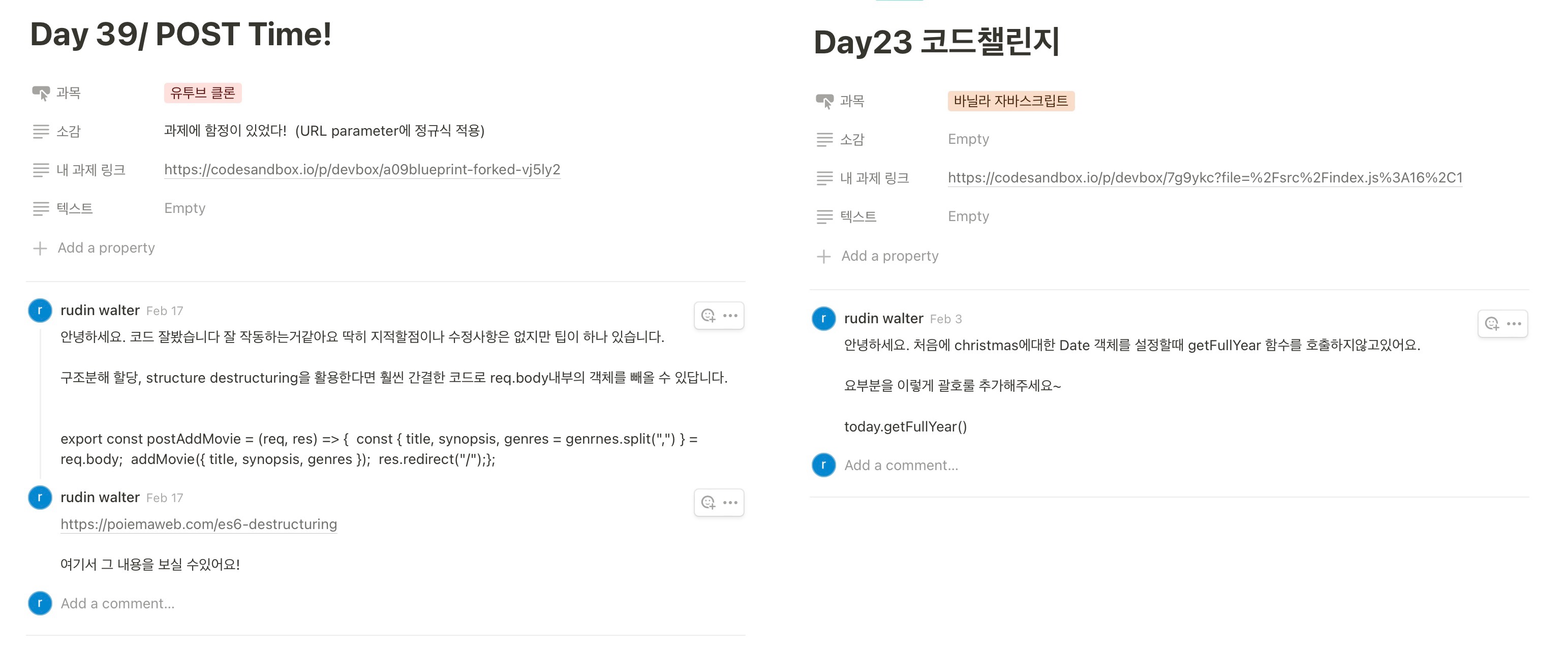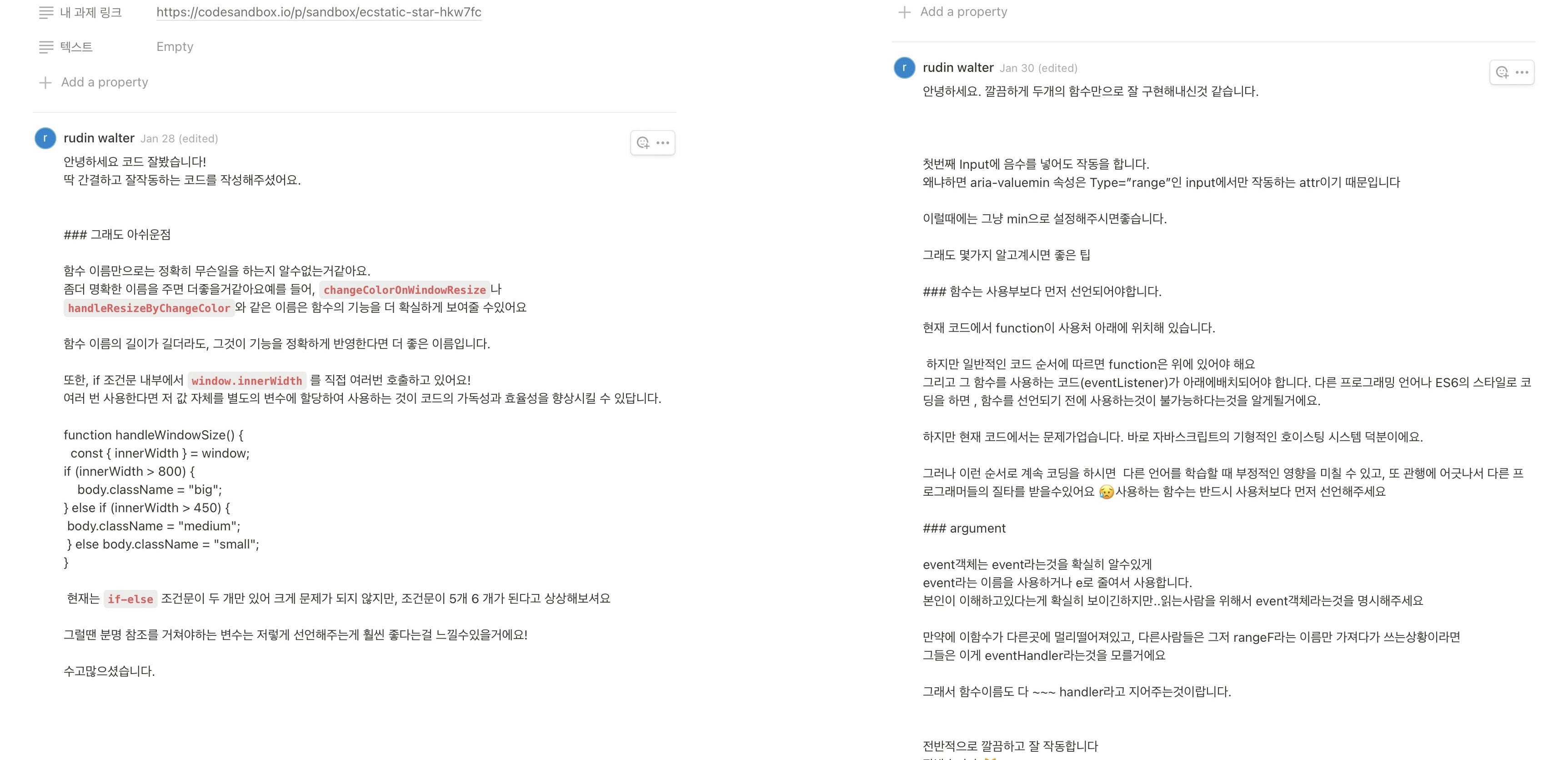 그리하여 정식 활동으로 채택되었고, 웹기초 6기의 팀 노션에서는 “코드리뷰란”이 운영되었다.