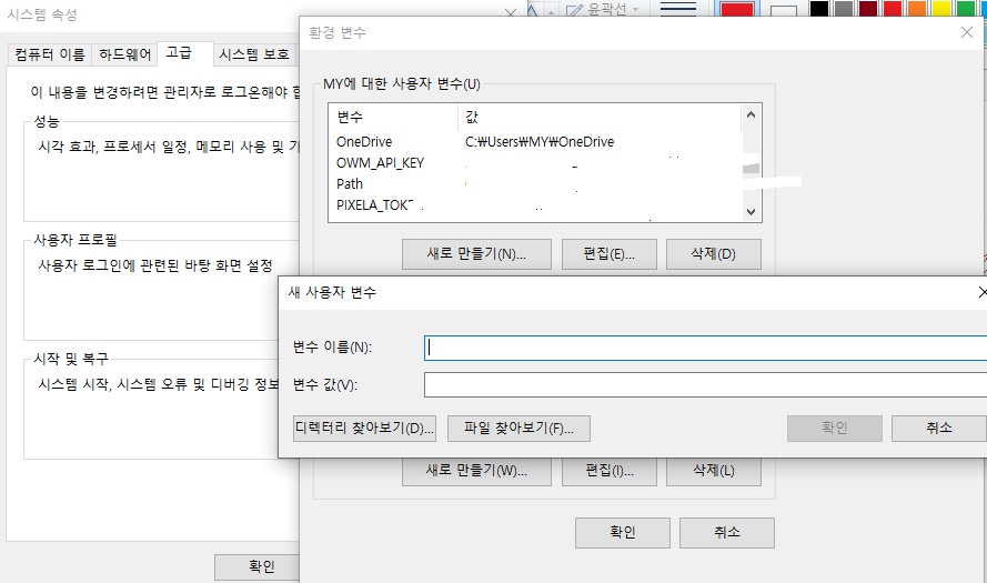 고급탭에서 환경변수 설정을클릭후 사용자변수에 본인이 사용할 변수를 저장한다.