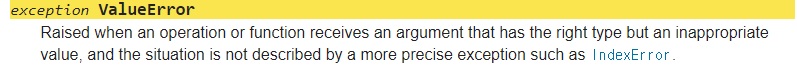 ValueError는 함수나 작업에 부적절한 값을 주었을경우 발생하는 오류이다.