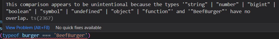 따라서 typeof buger의 반환값이 "BeefBurger"가 되는 것은 불가능하다.