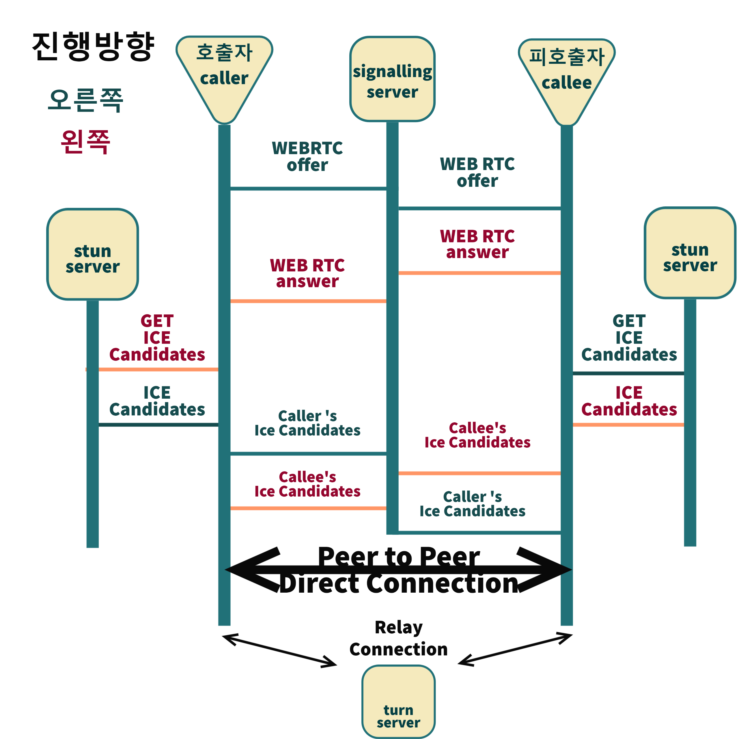 각 브라우저끼리 시그널링 서버(signaling server)를 통해