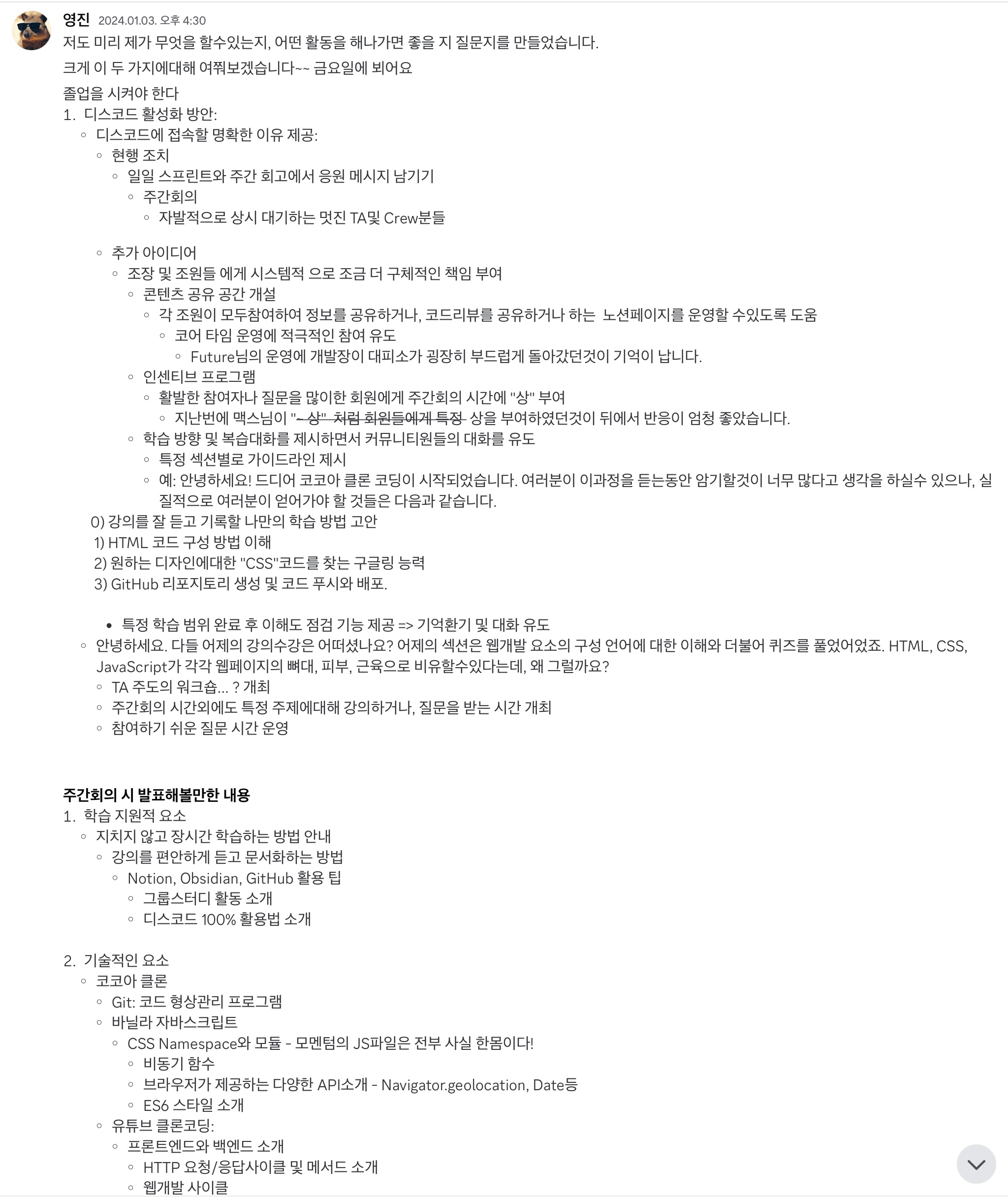 노마드 코더에서 Teaching Assistant로 활동했던 웹기초 6기가 끝났다. 이는 그에 대한 회고이다. 이는 복습을 위한 글도 아니고, 취업시장의 판관에게 제출하기위한 서류도 아니다. 그저 지난 10주 스터디의 기억이 다 스러지기 전에, 그 편린을 모아 간직하고 싶은 소망의 실현이다. # 1. 제안, 승낙 “영진님께 웹기초 TA를 맡아주실 의향이 있으신지 여쭤보려고요.” 보라님의 말씀이었다. 놀라웠다. 나는 커뮤니티 내부에서, 부끄러운 모습을 많이 보였었고 내가 만든 상황을수습하는 주체는 보라님을 비롯한 Crew분들이었다. 그런 내 치부를 모두 관찰한 보라님이 Teaching Assistant 합류에 대한 제안을 하고 계셨다. 더욱이 당황스러운것은, 발화의 태도였다. 그녀는 특별히 선심을 써서 내..